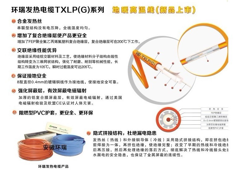 安徽環(huán)瑞提供的一種畜牧養(yǎng)殖幼崽專用發(fā)熱電纜,包括有發(fā)熱合金,所述的發(fā)熱合金外依次包覆有塑料導體、氟隆絕緣層、火焰及蒸汽交聯(lián)聚乙烯絕緣層、鍍錫紫銅絲接地、加厚型金屬電磁屏蔽層、阻燃型PVC外護套和彈性橡膠軟套,所述的發(fā)熱合金和塑料導體融為一體,防止電打火的情況發(fā)生。