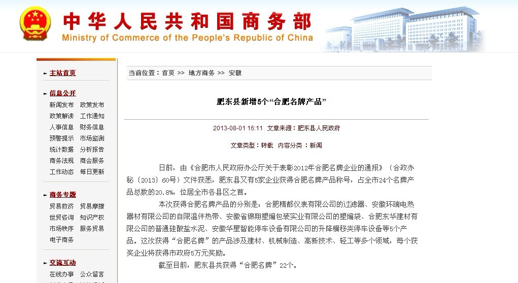 熱烈祝賀環(huán)瑞憑借自限溫電伴熱榮獲合肥名牌產(chǎn)品榮譽稱號,以下為中華人民共和國商務(wù)部轉(zhuǎn)載新聞,內(nèi)容如下: