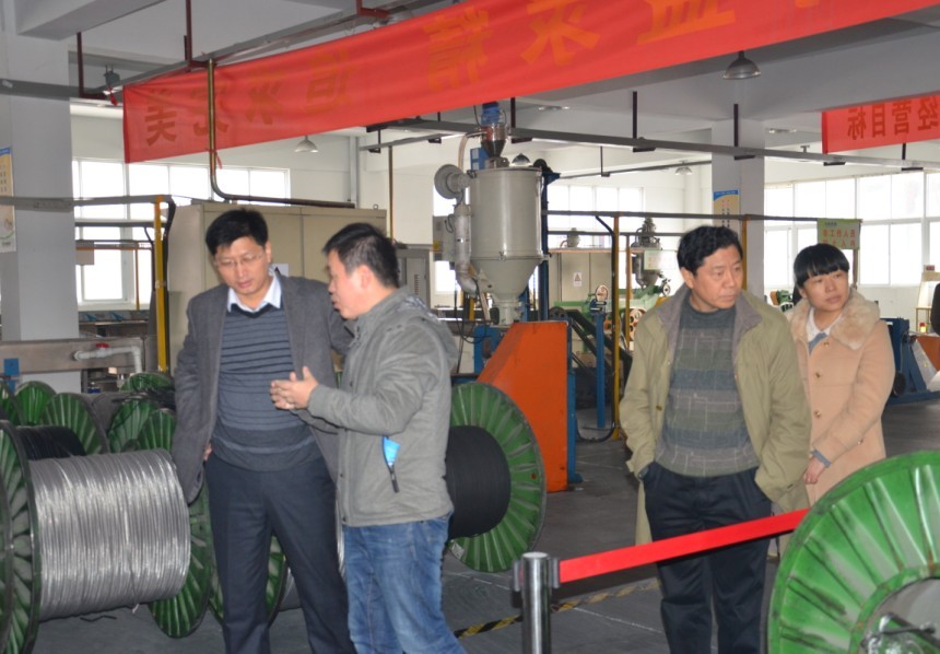 縣委孫書記、開發(fā)區(qū)領(lǐng)導(dǎo)仔細(xì)聆聽計總介紹關(guān)于我司自限溫電熱帶,恒功率電伴熱帶生產(chǎn)工藝流程