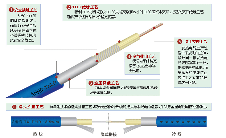 發(fā)熱電纜內(nèi)芯由冷線熱線組成,外面由絕緣層、接地、屏蔽層和外護套組成,發(fā)熱電纜通電后,熱線發(fā)熱,并在40~60℃的溫度間運行,埋設(shè)在填充層內(nèi)的發(fā)熱電纜,將熱能通過熱傳導(對流)的方式和發(fā)出的8-13um的遠紅外線輻射方式傳給受熱體。