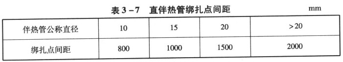 伴熱管應(yīng)與主管平行安裝,并應(yīng)自行排液。當(dāng)一根主管需要多根伴熱管伴熱時(shí),伴熱管之間的距離應(yīng)固定。水平伴熱管宜安裝在主管下方或靠近支架的側(cè)面,鉛垂伴熱管應(yīng)均勻分布在主管周?chē)坏脤闊峁苤苯狱c(diǎn)焊在主管上,而可采用綁扎帶或鍍鋅鐵絲等固定在主管上。彎頭部位的伴熱管綁扎帶不得少于3道,直伴熱管綁扎點(diǎn)間距應(yīng)符合表3一7的規(guī)定。