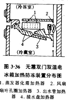 加熱防凍裝置中的出水管加熱器處于經(jīng)常加熱狀態(tài),接水盤加熱器和風(fēng)扇扇葉孔圈加熱器則僅在蒸發(fā)器加熱化霜時(shí)才工作。接水盤加熱器裝置在接水盤的外表面,其作用是防止霜水滴人接水盤內(nèi)凍結(jié)積累而損壞周圍結(jié)構(gòu)。裝置出水管加熱器的目的是防止霜水導(dǎo)出箱外時(shí)發(fā)生“冰堵”,造成霜水滋出盤外,淋濕并污染食品。風(fēng)扇扇葉孔圈加熱器裝置在風(fēng)扇扇葉孔圈部位,在對(duì)蒸發(fā)器加熱化霜時(shí)它對(duì)扇葉孔圈部位加熱,防止該部位因凝霜過(guò)厚而將扇葉卡住,造成箱內(nèi)冷風(fēng)的正常循環(huán)中斷,甚至燒毀風(fēng)扇電機(jī)。