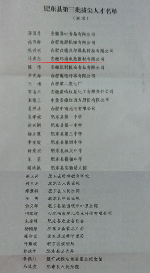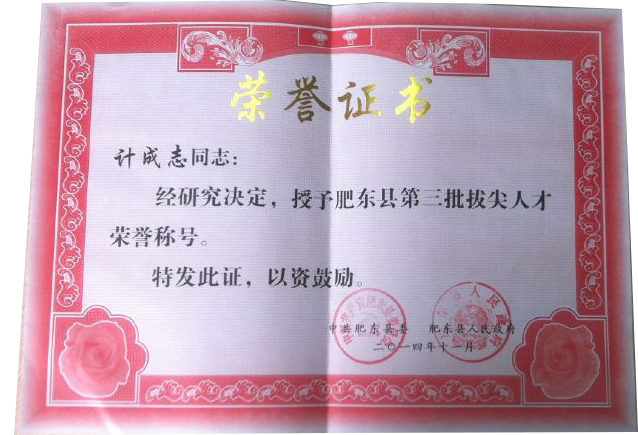 肥東縣委、縣政府為表彰環(huán)瑞公司對(duì)肥東縣當(dāng)?shù)亟?jīng)濟(jì)發(fā)展所作的貢獻(xiàn),特授予環(huán)瑞董事長計(jì)成志“肥東縣第三批拔尖人才”榮譽(yù)稱號(hào)。