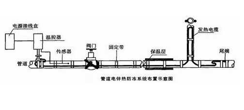 當(dāng)敷設(shè)單根電熱帶時(shí),敷設(shè)時(shí)應(yīng)盡可能使電熱帶平整地緊貼在管道表面,用聚酯帶或鋁箔膠帶固定,嚴(yán)禁用細(xì)絲捆扎,如遇法蘭、閥門等尖銳突起部分,應(yīng)注意保護(hù)。在水平管道上安裝時(shí),可敷設(shè)在管道下45度側(cè)方,用玻璃纖維壓敏膠帶或鋁膠帶每隔約30Cm處將電熱帶固定于管道上。如上圖電熱帶應(yīng)按管道長(zhǎng)度分布,以免物料在無電熱帶處降溫凝結(jié),電熱帶的長(zhǎng)度應(yīng)長(zhǎng)于被伴熱管道。在線路的第一供電點(diǎn)和尾端各預(yù)留1m長(zhǎng)的電熱帶。電熱帶在穿過墊木等支架時(shí),應(yīng)在支架上打眼穿孔,必須保證伴熱帶緊貼在管道上,再使用密封膠封堵。每個(gè)回路的電熱帶安裝完畢,再確認(rèn)整個(gè)回路長(zhǎng)度滿足設(shè)計(jì)要求后,才可剪短電熱帶。